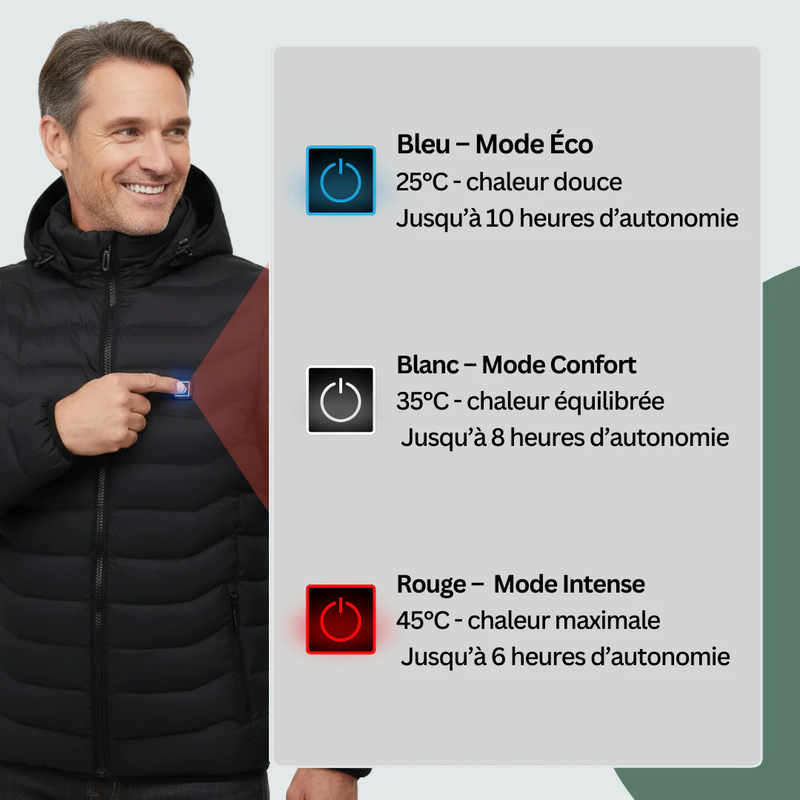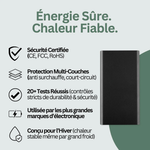 Restez au chaud toute la journée avec une batterie fine et certifiée — rechargeable partout via USB-C.