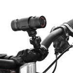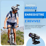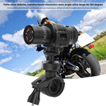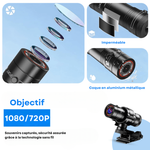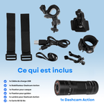 La caméra est livrée avec différents supports et attaches (casque, guidon, etc.), ce qui la rend simple à installer et adaptée à plusieurs usages.