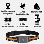 Contrairement aux gadgets Bluetooth qui perdent le signal après 10 à 15 mètres, ce collier fonctionne via GPS + carte SIM, pour un suivi précis même à des centaines de kilomètres. Il suffit d’une carte SIM avec < 50 Mo/mois (Free, SFR, Orange, etc.).